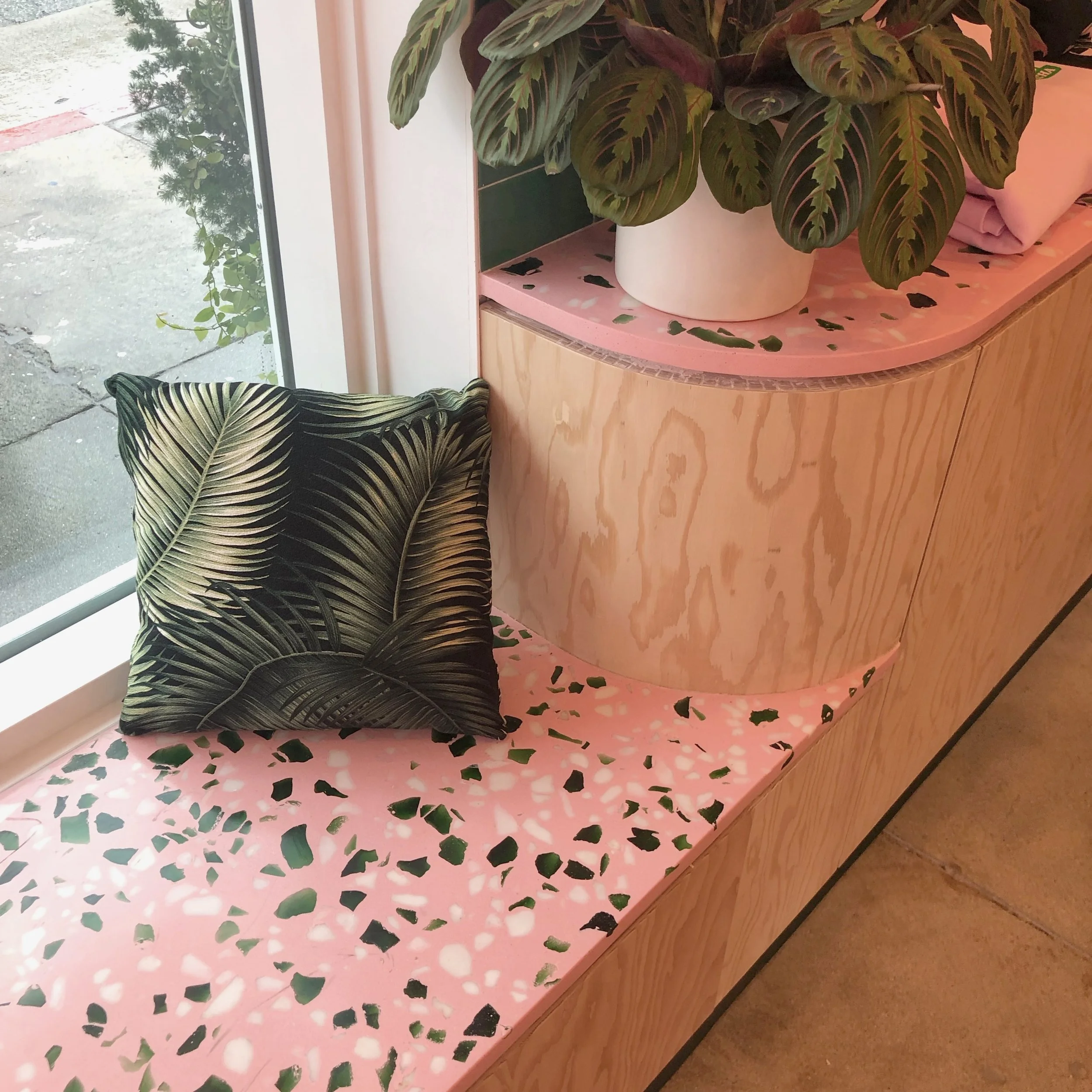 Strict permitting parameters required that Cha Cha Matcha create a café within a retail space at this already small location. Bifold windows with integrated exterior bench seating were used to open the space to the outside, creating a dynamic customer experience which flows onto the Abbot Kinney Boulevard sidewalk. Our design features custom-made pink terrazzo countertops, alongside pink stucco accents and green hues of powder-coated steel accessories. For a touch of warmth, marine-grade plywood was used to finish the ceiling as well as the millwork around the space.