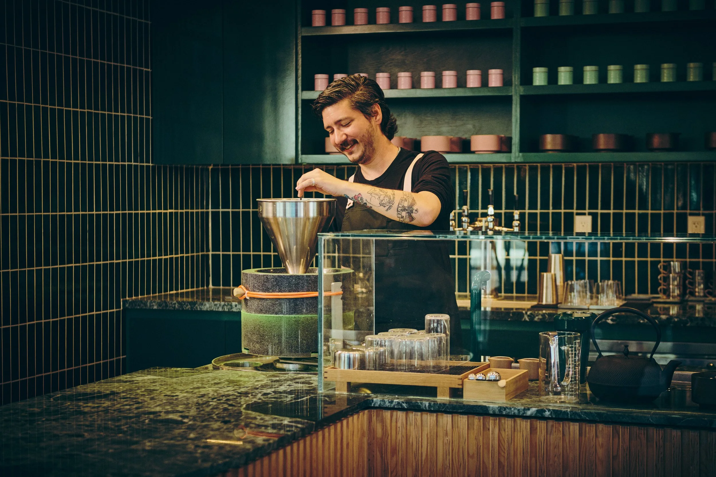 Designed as the Los Angeles flagship location, this store features 20’ tall ceilings with double-height windows facing North Beverly Drive in Beverly Hills. Bifold doors invite customers into the space, while allowing café seating to connect with the pedestrian traffic along the bustling sidewalk. An experiential matcha mixing station features dark green ceramic backsplash tiles and green marble countertops. The alcove lounge features a mint green sofa surrounded by the brand’s trademark marine-grade plywood paneling, and a slatted ceiling with integrated LED lighting and suspended planter boxes.